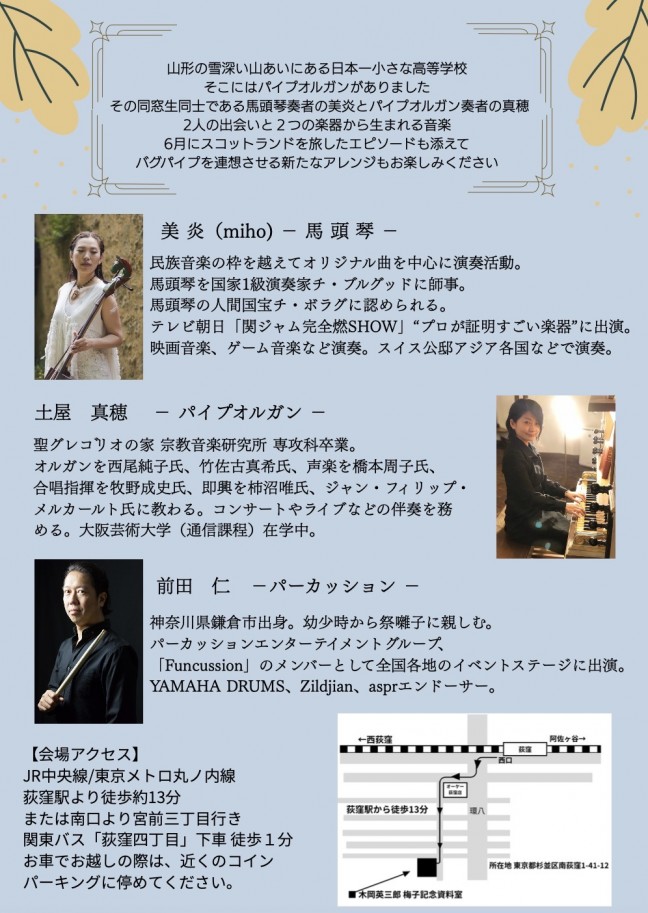 馬頭琴 美炎 パイプオルガン 土屋 真穂 パーカッション 前田 仁 |