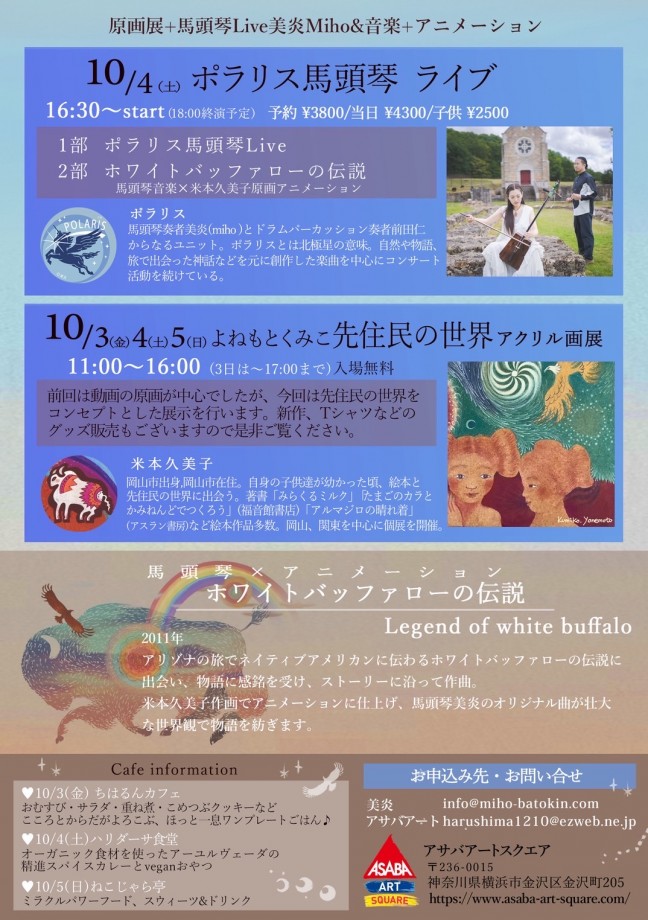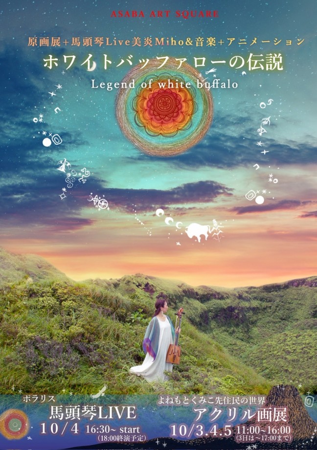 2025年10月4日(土) 16:30~start(18:30終演予定) 1部 ポラリス〜馬頭琴 美炎Live 2部 ホワイトバッファローの伝説 音楽×米本久美子原画アニメ |